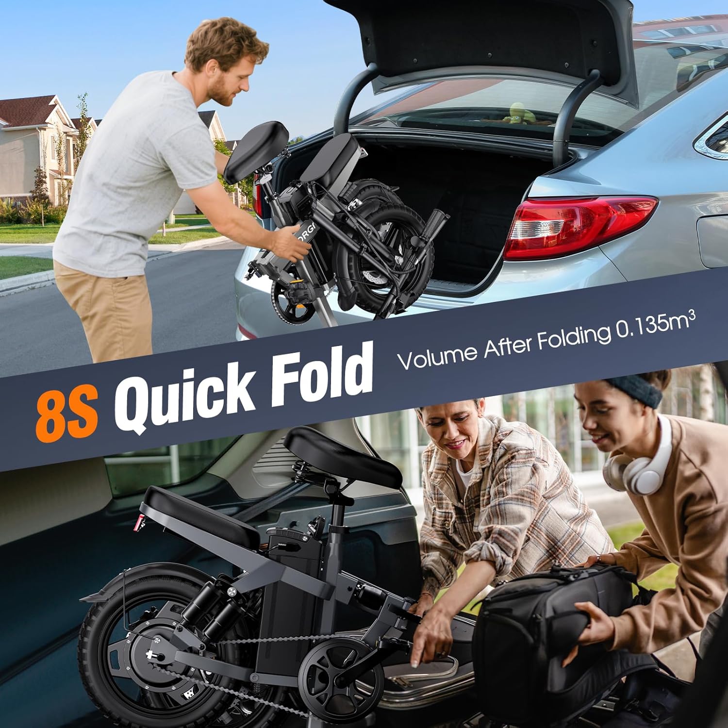 Su diseño plegable compacto, con ruedas de 14 pulgadas, permite reducir el volumen a menos de 0.135 m³, ideal para guardar en espacios reducidos o transportar fácilmente en vehículos.